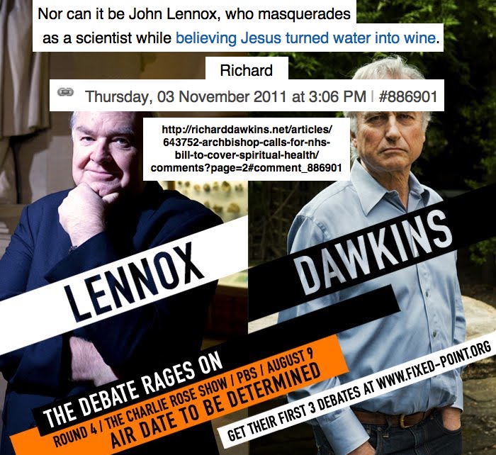 But who could predict that Dawkins would lose all sense of coherence and discernment while throwing his latest tantrum? In a recent forum post on his "clear-thinking oasis" website (Pretentiousness Police! Pull over!) Dawkins actually attacked Prof John Lennox, for being just as unworthy of engaging with as Dr Craig! His reason? That Lennox "masquerades as a scientist while believing Jesus turned water into wine"!
