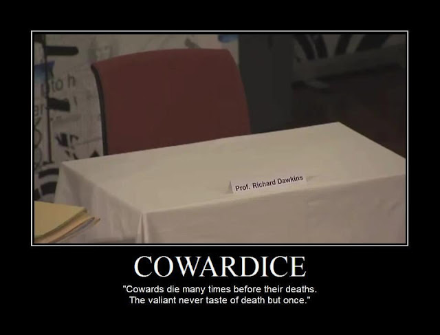 Many are familiar with his desperate attempts to undermine William Lane Craig, so to avoid manning up and debating him during his recent UK Tour. He's given at least 12 excuses over the past 4 years, the most recent of which was a smokescreen that even fellow atheists saw through: "I really don't like how 'dr' Craig interprets a particular old testament narrative, therefore I don't need to engage with his arguments for theism or criticisms of my multi-million-selling, non-peer-reviewed book".